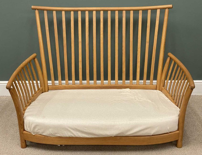 ERCOL MEDIUM COLOURED SLATTED BACK SOFA, 98 (h) x 142 (w) x 78cms (d), and matching armchair, 98 (h) x 87 (w) x 74cms (d)Provenance: private collection Gwynedd