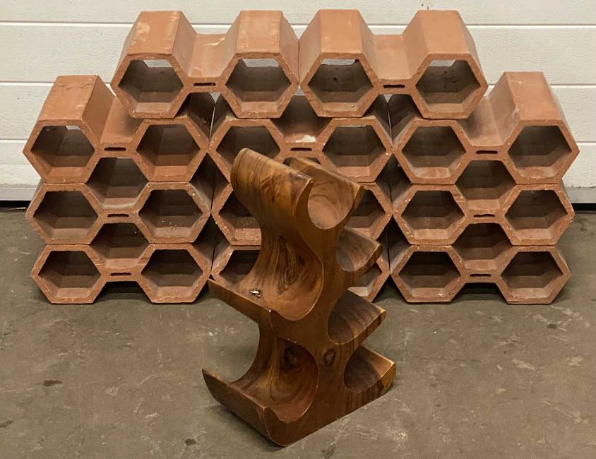 BRICK 'WINE' STORERS and a fancy modern rosedwood bottle rack