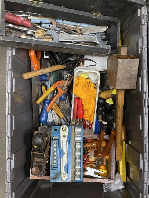 TWO CRATES OF GARDEN HAND POWER TOOLS & ACCESSORIESProvenance: private collection Anglesey