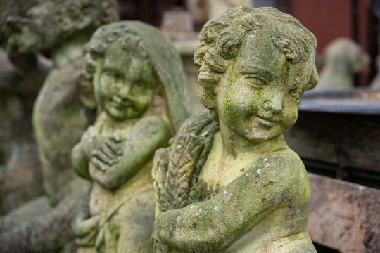 PAIR OF MOULDED CONCRETE ALLEGORICAL FIGURES OF THE SEASONS, modelled as putti with wheat sheaves and draped cowl, allegorical of summer and winter, 82cms (h) (2)Provenance: The Cornelia Bayley Collection from Plas Teg, an important Jacobean house in Flintshire, North Wales Plas Teg: Once in a Generation Welsh House Clearance — Rogers Jones CoNote: the auction lots are contained in a warehouse near Wrexham. Viewing can be arranged by appointment by calling Richard Hughes on 07593 181017. Purchased lots require collection by appointment once invoices are settled and strictly within ten days (maximum) from the auction date. Purchases which are not collected by this time will incur a charge of £50 per item per day. Please note that most HGV vehicles can enter the warehouse for convenient collection, but we do not offer assistance for heavy and large objects, please be prepared.