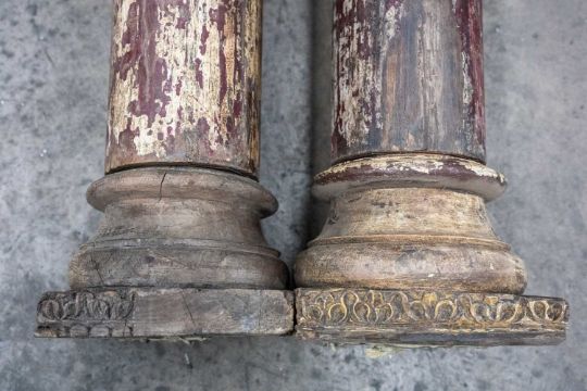 PAIR OF PAINTED HARDWOOD ARCHITECTURAL COLUMNS, with carved and painted capitals, 280cms (h)Provenance: The Cornelia Bayley Collection from Plas Teg, an important Jacobean house in Flintshire, North Wales Plas Teg: Once in a Generation Welsh House Clearance — Rogers Jones CoNote: the auction lots are contained in a warehouse near Wrexham. Viewing can be arranged by appointment by calling Richard Hughes on 07593 181017. Purchased lots require collection by appointment once invoices are settled and strictly within ten days (maximum) from the auction date. Purchases which are not collected by this time will incur a charge of £50 per item per day. Please note that most HGV vehicles can enter the warehouse for convenient collection, but we do not offer assistance for heavy and large objects, please be prepared.