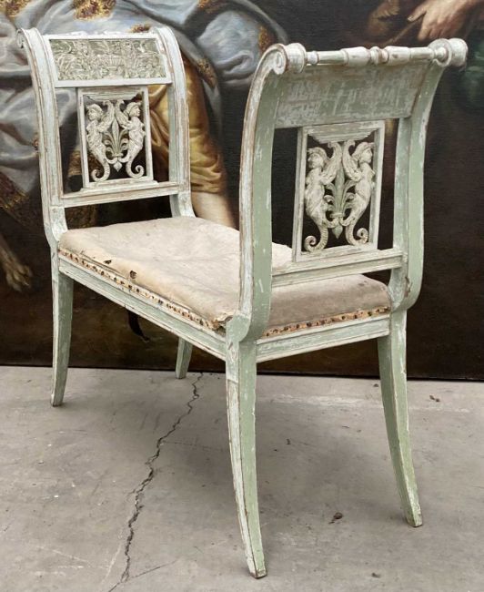 18TH C. STYLE PAINTED WOOD WINDOW SEAT, pierced scroll end supports, on channelled sabre legs, 81 (h) x 100 (w) x 34cms (d)Comments: seat unupholstered and sagged, otherwise frame sturdy, viewing recommendedProvenance: The Cornelia Bayley Collection from Plas Teg, an important Jacobean house in Flintshire, North Wales Plas Teg: Once in a Generation Welsh House Clearance — Rogers Jones CoNote: the auction lots are contained in a warehouse near Wrexham. Viewing can be arranged by appointment by calling Richard Hughes on 07593 181017. Purchased lots require collection by appointment once invoices are settled and strictly within ten days (maximum) from the auction date. Purchases which are not collected by this time will incur a charge of £50 per item per day. Please note that most HGV vehicles can enter the warehouse for convenient collection, but we do not offer assistance for heavy and large objects, please be prepared.