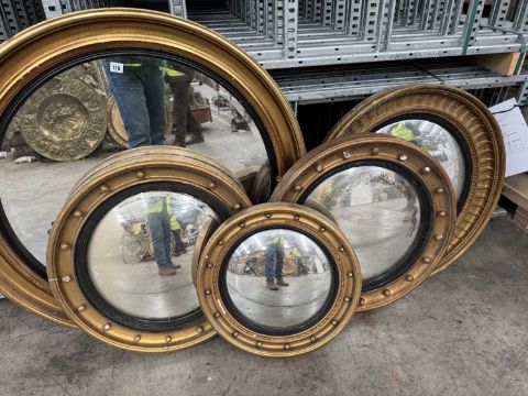 19TH C. & LATER CONVEX CIRCULAR WALL MIRRORS, of similar typical design, various sizes (5)Provenance: The Cornelia Bayley Collection from Plas Teg, an important Jacobean house in Flintshire, North Wales Plas Teg: Once in a Generation Welsh House Clearance — Rogers Jones CoNote: the auction lots are contained in a warehouse near Wrexham. Viewing can be arranged by appointment by calling Richard Hughes on 07593 181017. Purchased lots require collection by appointment once invoices are settled and strictly within ten days (maximum) from the auction date. Purchases which are not collected by this time will incur a charge of £50 per item per day. Please note that most HGV vehicles can enter the warehouse for convenient collection, but we do not offer assistance for heavy and large objects, please be prepared.