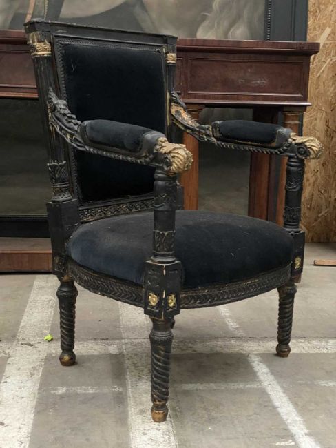 WILLIAM IV STYLE PARCEL-GILT & EBONISED ARMCHAIR, foliate carved detailing, black velvet upholstery, 91cms (h)Comments: lacking cresting rail and finials, damaged left arm, later painted, viewing recommendedProvenance: The Cornelia Bayley Collection from Plas Teg, an important Jacobean house in Flintshire, North Wales Plas Teg: Once in a Generation Welsh House Clearance — Rogers Jones CoNote: the auction lots are contained in a warehouse near Wrexham. Viewing can be arranged by appointment by calling Richard Hughes on 07593 181017. Purchased lots require collection by appointment once invoices are settled and strictly within ten days (maximum) from the auction date. Purchases which are not collected by this time will incur a charge of £50 per item per day. Please note that most HGV vehicles can enter the warehouse for convenient collection, but we do not offer assistance for heavy and large objects, please be prepared.