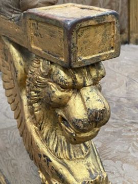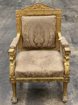 ITALIAN EMPIRE GILTWOOD ARMCHAIR, Rome, c. 1815, design attributed to Lorenzo Santi, with triangular toprail with opposing griffins and foliage, the frieze with stylised undulalting foliate tendrils, padded back, armrests and seat, fluted uprights with leaf capitals, with winged lion supports, fluted seat rail on lion monopodia legs headded by panelled flowerheads, paw feet.Comments: gilding rubbed, upholstery stained, worn, and damaged, frames sturdy, viewing recommendedProvenance: The Cornelia Bayley Collection from Plas Teg, an important Jacobean house in Flintshire, North Wales Plas Teg: Once in a Generation Welsh House Clearance — Rogers Jones CoNote: the auction lots are contained in a warehouse near Wrexham. Viewing can be arranged by appointment by calling Richard Hughes on 07593 181017. Purchased lots require collection by appointment once invoices are settled and strictly within ten days (maximum) from the auction date. Purchases which are not collected by this time will incur a charge of £50 per item per day. Please note that most HGV vehicles can enter the warehouse for convenient collection, but we do not offer assistance for heavy and large objects, please be prepared.