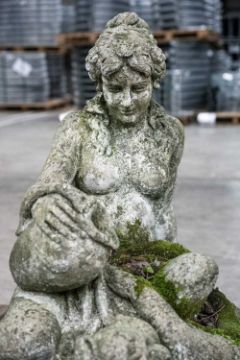 RECONSTITUTED STONE FIGURAL FOUNTAIN, modelled as naked nymph with ewer, putto, beside tambourine and grapevines, upon circular waisted plinth and pedestal base, overall 152cms (h)Provenance: The Cornelia Bayley Collection from Plas Teg, an important Jacobean house in Flintshire, North Wales Plas Teg: Once in a Generation Welsh House Clearance — Rogers Jones CoNote: the auction lots are contained in a warehouse near Wrexham. Viewing can be arranged by appointment by calling Richard Hughes on 07593 181017. Purchased lots require collection by appointment once invoices are settled and strictly within ten days (maximum) from the auction date. Purchases which are not collected by this time will incur a charge of £50 per item per day. Please note that most HGV vehicles can enter the warehouse for convenient collection, but we do not offer assistance for heavy and large objects, please be prepared.