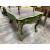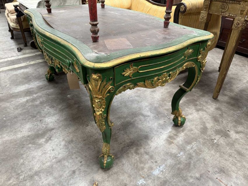 ROCOCO STYLE GREEN & GILT PAINTED LIBRARY DESK, possibly Italian, single frieze drawer, Serpentine outline, cabriole legs on ball and claw feet, inset faux leather top, dummy handles to one side, 77 (h) x 149 (w) x 84cms (d)Comments: faux leather peeling away in places with marks and stains, one dummy handle loose, some splits, wear and loss to painted decoration, viewing recommendedProvenance: The Cornelia Bayley Collection from Plas Teg, an important Jacobean house in Flintshire, North Wales Plas Teg: Once in a Generation Welsh House Clearance — Rogers Jones CoNote: the auction lots are contained in a warehouse near Wrexham. Viewing can be arranged by appointment by calling Richard Hughes on 07593 181017. Purchased lots require collection by appointment once invoices are settled and strictly within ten days (maximum) from the auction date. Purchases which are not collected by this time will incur a charge of £50 per item per day. Please note that most HGV vehicles can enter the warehouse for convenient collection, but we do not offer assistance for heavy and large objects, please be prepared.