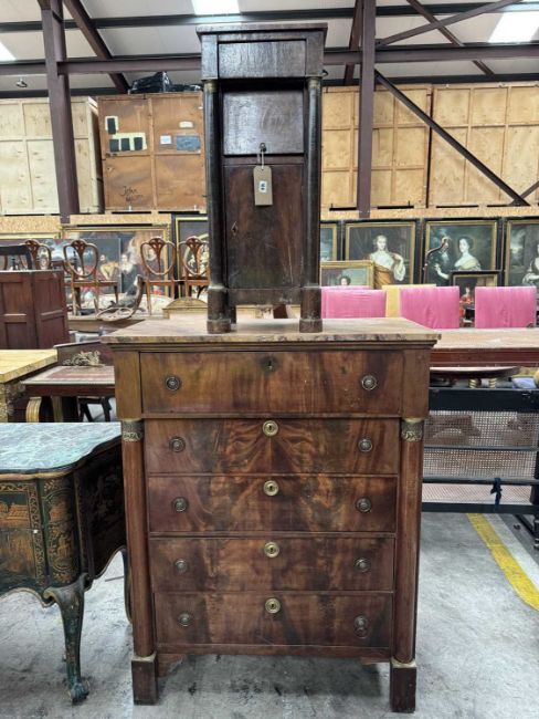 FRENCH EMPIRE STYLE TALL MAHOGANY CHEST, five drawers, brass mounted column pilasters, simulated marble top, 129 (h) x 101 (w) x 50cms (d) together with similar BEDSIDE CABINET (2)Comments: scuffs, wear and losses in places, splits to nightstand and veneer loss, bubbling, viewing recommendedProvenance: The Cornelia Bayley Collection from Plas Teg, an important Jacobean house in Flintshire, North Wales Plas Teg: Once in a Generation Welsh House Clearance — Rogers Jones CoNote: the auction lots are contained in a warehouse near Wrexham. Viewing can be arranged by appointment by calling Richard Hughes on 07593 181017. Purchased lots require collection by appointment once invoices are settled and strictly within ten days (maximum) from the auction date. Purchases which are not collected by this time will incur a charge of £50 per item per day. Please note that most HGV vehicles can enter the warehouse for convenient collection, but we do not offer assistance for heavy and large objects, please be prepared.