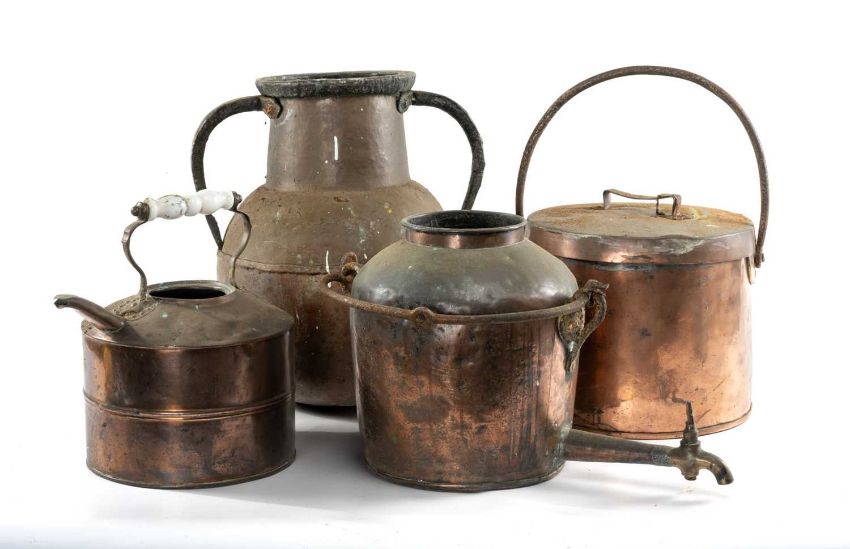 FOUR COPPER VESSELS, including large kettle, covered saucepan, large two-handled vase, 47cms (h), etc. (4)Comments: kettle lacks cover, worn, dentedProvenance: The Cornelia Bayley Collection from Plas Teg, an important Jacobean house in Flintshire, North Wales Plas Teg: Once in a Generation Welsh House Clearance — Rogers Jones CoNote: the auction lots are contained in a warehouse near Wrexham. Viewing can be arranged by appointment by calling Richard Hughes on 07593 181017. Purchased lots require collection by appointment once invoices are settled and strictly within ten days (maximum) from the auction date. Purchases which are not collected by this time will incur a charge of £50 per item per day. Please note that most HGV vehicles can enter the warehouse for convenient collection, but we do not offer assistance for heavy and large objects, please be prepared.