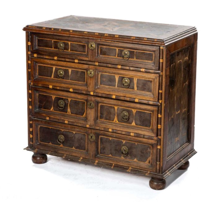 LATE 17TH C. STYLE OYSTER VENEERED CHEST, possibly cocus wood, star-decorated moulded top, fitted four panelled graduated drawers, on bun feet, 82 (h) x 87 (w) x 49cms (d)Comments: moulding section missing to front left, top with later rose inlay, please request further images if necessaryProvenance: The Cornelia Bayley Collection from Plas Teg, an important Jacobean house in Flintshire, North Wales Plas Teg: Once in a Generation Welsh House Clearance — Rogers Jones CoNote: the auction lots are contained in a warehouse near Wrexham. Viewing can be arranged by appointment by calling Richard Hughes on 07593 181017. Purchased lots require collection by appointment once invoices are settled and strictly within ten days (maximum) from the auction date. Purchases which are not collected by this time will incur a charge of £50 per item per day. Please note that most HGV vehicles can enter the warehouse for convenient collection, but we do not offer assistance for heavy and large objects, please be prepared.
