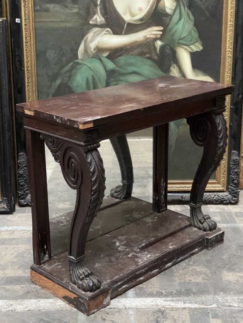 GEORGE IV MAHOGANY PIER TABLE, acanthus scrolled lion's paw feet to platform base, mirror back, 87 (h) x 108 (w) x 48cms (d)Comments: some veneer losses to base and corners, surface scratches, otherwise sturdy, viewing recommendedProvenance: The Cornelia Bayley Collection from Plas Teg, an important Jacobean house in Flintshire, North Wales Plas Teg: Once in a Generation Welsh House Clearance — Rogers Jones CoNote: the auction lots are contained in a warehouse near Wrexham. Viewing can be arranged by appointment by calling Richard Hughes on 07593 181017. Purchased lots require collection by appointment once invoices are settled and strictly within ten days (maximum) from the auction date. Purchases which are not collected by this time will incur a charge of £50 per item per day. Please note that most HGV vehicles can enter the warehouse for convenient collection, but we do not offer assistance for heavy and large objects, please be prepared.