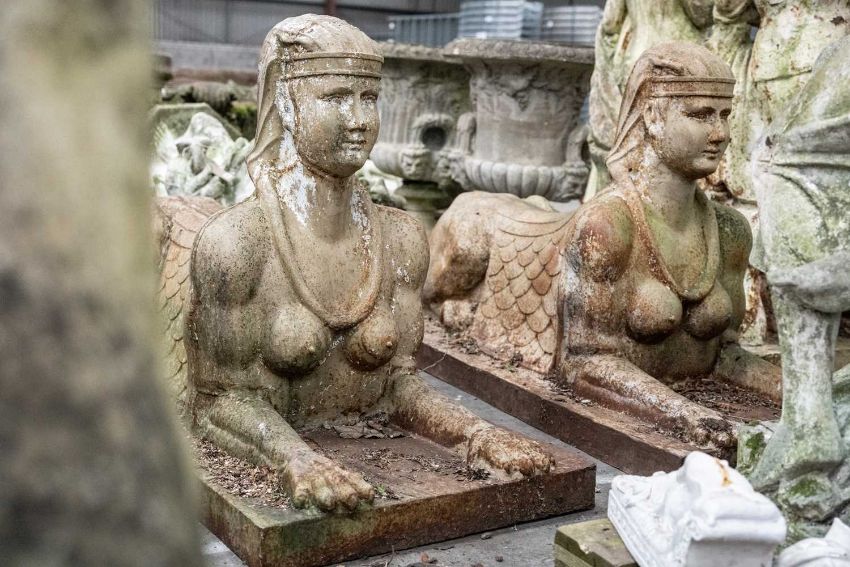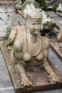LARGE PAIR OF PAINTED CAST IRON SPHINXES, on rectangular plinth bases, 94 (h) 160 (w) x 69cms (d) (2)Comments: ordinary surface oxidation/rust, as expectedProvenance: The Cornelia Bayley Collection from Plas Teg, an important Jacobean house in Flintshire, North Wales Plas Teg: Once in a Generation Welsh House Clearance — Rogers Jones CoNote: the auction lots are contained in a warehouse near Wrexham. Viewing can be arranged by appointment by calling Richard Hughes on 07593 181017. Purchased lots require collection by appointment once invoices are settled and strictly within ten days (maximum) from the auction date. Purchases which are not collected by this time will incur a charge of £50 per item per day. Please note that most HGV vehicles can enter the warehouse for convenient collection, but we do not offer assistance for heavy and large objects, please be prepared.