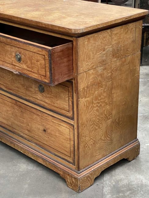 LATE 19TH C. BURR ASH CHEST, fitted three graduated drawers, bracket feet, 99 (h) x 121 (w) x 61cms (d)Comments: some mouldings damaged, scratched, back upper panel missing, viewing recommendedProvenance: The Cornelia Bayley Collection from Plas Teg, an important Jacobean house in Flintshire, North Wales Plas Teg: Once in a Generation Welsh House Clearance — Rogers Jones CoNote: the auction lots are contained in a warehouse near Wrexham. Viewing can be arranged by appointment by calling Richard Hughes on 07593 181017. Purchased lots require collection by appointment once invoices are settled and strictly within ten days (maximum) from the auction date. Purchases which are not collected by this time will incur a charge of £50 per item per day. Please note that most HGV vehicles can enter the warehouse for convenient collection, but we do not offer assistance for heavy and large objects, please be prepared.