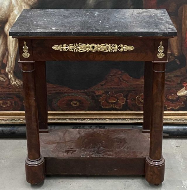 MARBLE TOP CONSOLE TABLE, grey marble top, 85 (h) x 74 (w) x 37cms (d)Provenance: The Cornelia Bayley Collection from Plas Teg, an important Jacobean house in Flintshire, North Wales Plas Teg: Once in a Generation Welsh House Clearance — Rogers Jones CoNote: the auction lots are contained in a warehouse near Wrexham. Viewing can be arranged by appointment by calling Richard Hughes on 07593 181017. Purchased lots require collection by appointment once invoices are settled and strictly within ten days (maximum) from the auction date. Purchases which are not collected by this time will incur a charge of £50 per item per day. Please note that most HGV vehicles can enter the warehouse for convenient collection, but we do not offer assistance for heavy and large objects, please be prepared.