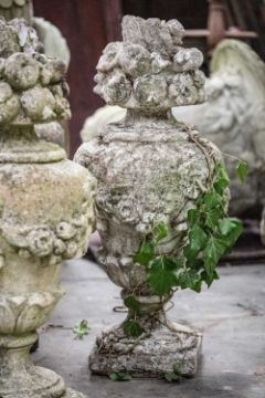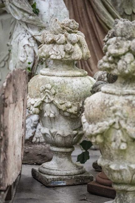 GROUP OF RECONSTITUTED STONE URNS, comprising set of four painted urns with floral finials, 80cms (h), and another smaller, painted red, 56cms (h) (5)Provenance: The Cornelia Bayley Collection from Plas Teg, an important Jacobean house in Flintshire, North Wales Plas Teg: Once in a Generation Welsh House Clearance — Rogers Jones CoNote: the auction lots are contained in a warehouse near Wrexham. Viewing can be arranged by appointment by calling Richard Hughes on 07593 181017. Purchased lots require collection by appointment once invoices are settled and strictly within ten days (maximum) from the auction date. Purchases which are not collected by this time will incur a charge of £50 per item per day. Please note that most HGV vehicles can enter the warehouse for convenient collection, but we do not offer assistance for heavy and large objects, please be prepared.