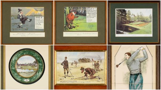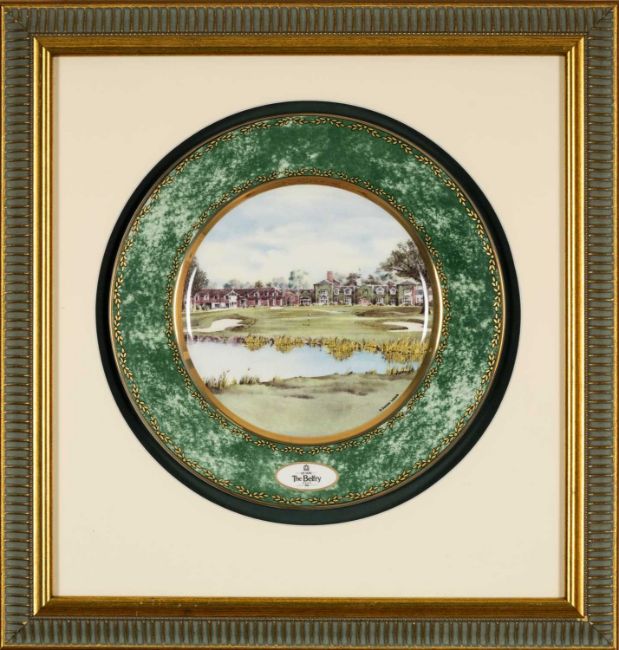 THE GOLF CLUB HOUSE: FRAMED PRINTS & CERAMICS RELATING TO GOLF, including tiles entitled 'The Golfing Legends H. Cotton, British Open 1934', framed De Vere The Belfry plate, Graham Baxter print - USA Open at Augusta, signed and dated '90, Crombie 'Rules of Golf', etc. (6)Provenance: private collection BridgendComments: all framed, some glazed