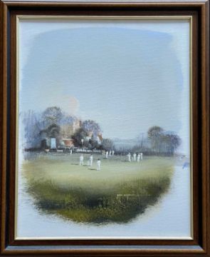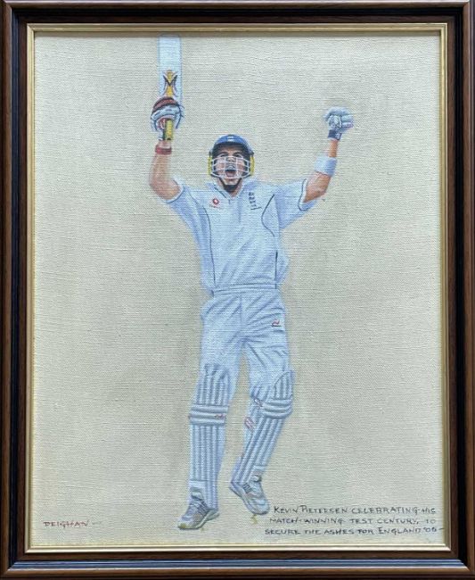 THE CRICKET CLUB HOUSE: TWO CRICKET THEMED OILS ON CANVAS, Peter Deighan - Kevin Peterson celebrating his match winning test century, signed, and John Horsewell - village cricket scene, signed, both approx. 50 x 40cmsProvenance: private collection BridgendComments: both framed