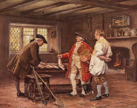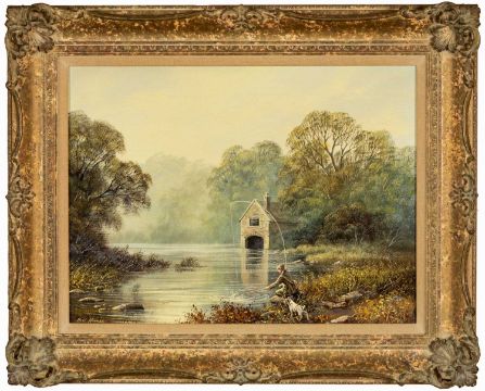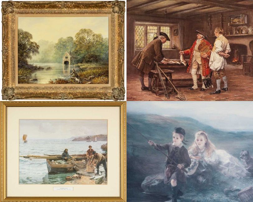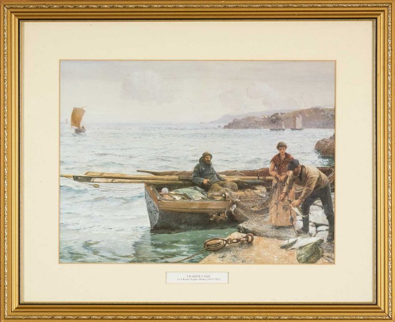 THE FISHING CLUB HOUSE: PRINTS & OILS RELATING TO FISHING, including Bill Haynes oil on canvas - fisherman at the waterside with his dog, signed to left corner, Charles Napier Hemy print - entitled 'Crabber's Bait', Otto Leyde print - 'Fishing in Scotland', E. M. Bennett print - men taking fish from their creel, dated 1929Provenance: private collection BridgendComments: framed and glazed