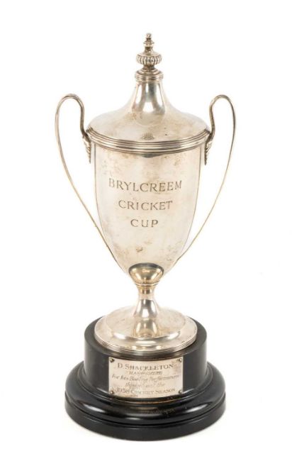 THE CRICKET CLUB HOUSE: SILVER CRICKET TROPHY, entitled ‘Brylcreem Cricket Cup’, plinth with plaque engraved ‘D. Shackleton, Hampshire, For his Bowling Performances through out the 1958 Cricket Season’, Garrard and Co. 1958, 10ozt, 23.5cms (h), ebonised wood plinth also marked ‘Garrard’Provenance: private collection Bridgend