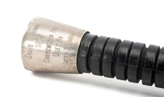 HORSE RACING CLUB HOUSE: 1979 GRAND NATIONAL JOCKEY'S CROP, used by Taffy Salaman on Churchtown Boy, engraved cap to the fibreglass stem with leather thong, 74cmsProvenance: private collection Vale of GlamorganComment: good overall