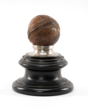 THE CRICKET CLUB HOUSE: NOVELTY EDWARDIAN CRICKET BALL TROPHY, leather ball mounted on silver collar and turned ebonised plinth base, silver hallmarked Birmingham 1909, 15.5cms (h)Provenance: private collection Bridgend