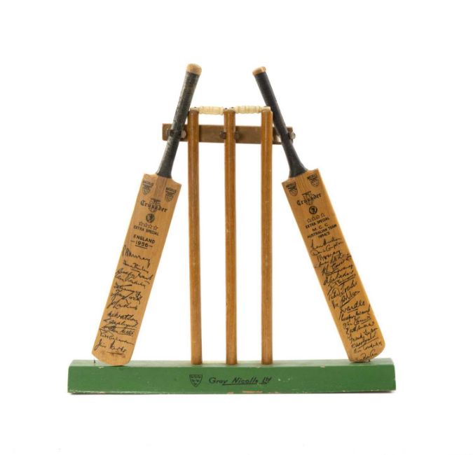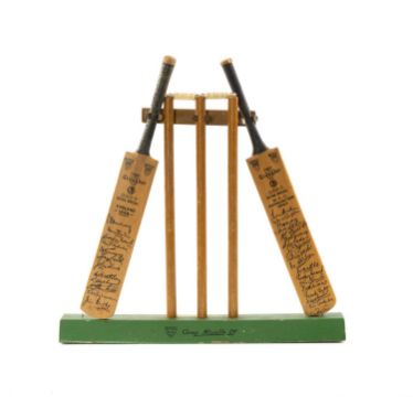 THE CRICKET CLUB HOUSE: NOVELTY GRAY-NICOLLS LTD. CRICKET TROPHY, modelled as wicket with plastic bales and pair Crusader souvenir cricket bats, signed by England and Australia teams 1956 and 1954/5Provenance: private collection BridgendComments: one bale broken