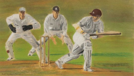 THE CRICKET CLUB HOUSE: STEPHEN J. SIMPSON pencil sketch - Gillette Cup semi-final, dated 1974, possibly depicting Somerset vs. Kent on August 14, 1974, with Viv Richards at the crease, and Pavlina Samwellová pastel - entitled 'The Cricketers' (2)Provenance: private collection BridgendComments: framed and glazed