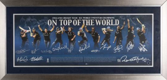 THE CRICKET CLUB HOUSE: I.C.C. WORLD 2020 SIGNED PRINT, limited edition (54/100), with COA attached, signatures include Paul Collingwood, Kevin Peterson, Ryan Sidebottom, Graeme Swann, Stuart Broad, etc., 41 x 93cmsProvenance: private collection NewportComments: framed and glazed
