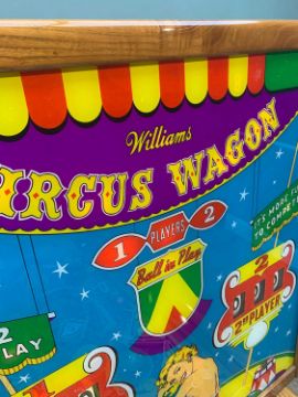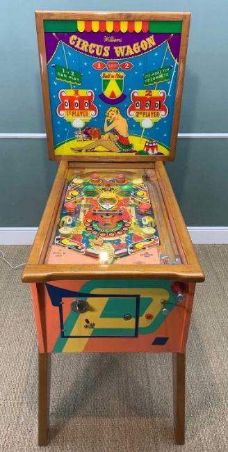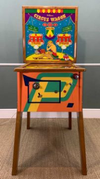 THE ARCADE CLUB HOUSE: WILLIAMS 'CIRCUS WAGON' PINBALL MACHINE, Williams Manufacturing Company, Chicago, c. 1955, designed by Harry Williams with art by George Molentin, option of two players, five ball play, having flippers, pop bumpers, passive bumpers, slingshots, kickout hole and gobble hole, 177 (h) x 75 (w) x 138cms (d)Auctioneer's Note: Pinball originated from the 18th-century French game of bagatelle, which was played on a mini pool table where players used a cue to strike balls off various pins and into scoring pockets. In 1871, British inventor Montague Redgrave enhanced the game by replacing the balls with marbles, reducing the size of the table, and substituting the cue with a coiled spring and plunger. Modern pinball machines started appearing on the market in the early 1930s. While coin-operated, they lacked some of the features we associate with pinball machines today, such as bumpers, flippers, and tilt mechanisms. As an affordable form of entertainment, pinball gained popularity during the Great Depression, although its growth was temporarily halted during World War II, as U.S. manufacturing resources were redirected to the war effort. Pinball machines were banned in major cities like Chicago, New York, and Los Angeles from the 1930s to the mid-1970s due to their alleged connections to organized crime and gambling. New York Mayor Fiorello La Guardia claimed that pinball was a "racket dominated by interests heavily tainted with criminality," and his successor, Mayor William O'Dwyer, officially made pinball machines illegal in 1948. The ban remained in place for 28 years until 1976, when pinball player and designer Roger Sharpe demonstrated to the New York City Council that pinball was a game of skill, not chance.Provenance: private collection Vale of GlamorganComments: play field in good bright colours with little ware; restored by an enthusiast, complete with keys and restoration notes, plugged and plays, however all circuits untested, HEAVY item, will require at least two to collect
