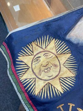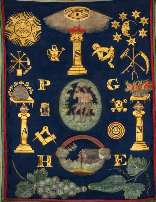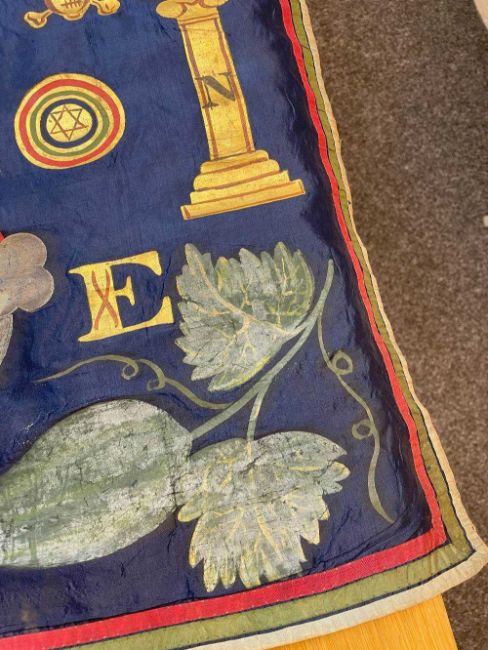 THE GARDENING CLUB HOUSE: antique 'Free Gardeners' painted silk banner, featuring the watering can, pruning knife/sicle, Garden of Eden, Ark, gardening tools, beehive, etc. and initials P G / H E, 88 x 70cms, unmounted with stained pine poleProvenance: private collection Swanseafruit/flower basket,Auctioneers Notes: The Order of Free Gardeners is a fraternal society that was founded in Scotland in the middle of the 17th century and later spread to England and Ireland. Like numerous other friendly societies of the time, its principal aim was the sharing of secret knowledge linked to the profession and mutual aid. In the 19th century, its activities of mutual insurance became predominant. By the end of the 20th C, it had become almost entirely extinct. With thanks to Christopher Powell for the cataloguing of this lot.Comments: split along vertical crease to lower portion, minor creases/rubbing as expected, otherwise good.