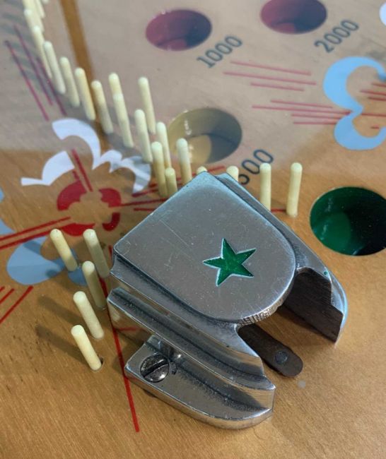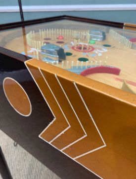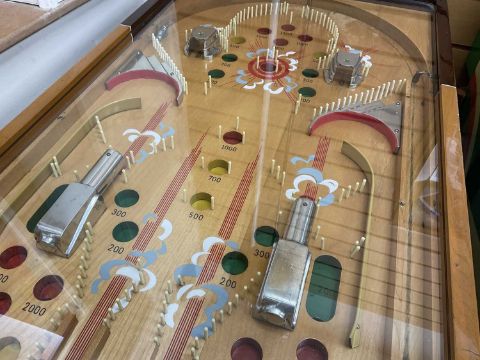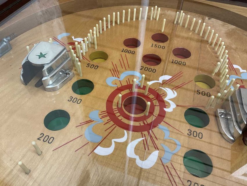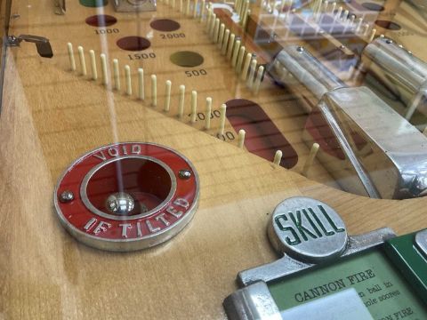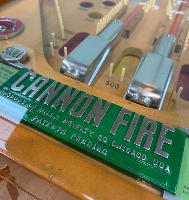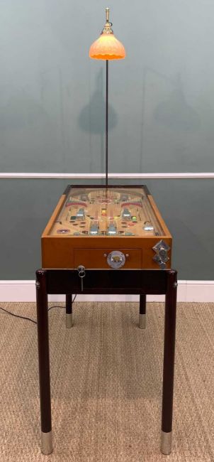 THE ARCADE CLUB HOUSE: MILLS 'CANNON FIRE' ELECTRO-MECHANICAL PINBALL MACHINE, Mills Novelty Company, Chicago, c. 1935, designed by Kenneth C. Shyvers c. 1934, having ten large glass balls, cannons and hardware in polished aluminium, with four loaded cannons, later overhanging light, cabinet believed designed by Eckland, 193 (h) (with lamp) / 92 (h) (without lamp) x 39 x 102cms (d)Auctioneer's Note: Pinball originated from the 18th-century French game of bagatelle, which was played on a mini pool table where players used a cue to strike balls off various pins and into scoring pockets. In 1871, British inventor Montague Redgrave enhanced the game by replacing the balls with marbles, reducing the size of the table, and substituting the cue with a coiled spring and plunger. Modern pinball machines started appearing on the market in the early 1930s. While coin-operated, they lacked some of the features we associate with pinball machines today, such as bumpers, flippers, and tilt mechanisms. As an affordable form of entertainment, pinball gained popularity during the Great Depression, although its growth was temporarily halted during World War II, as U.S. manufacturing resources were redirected to the war effort. Pinball machines were banned in major cities like Chicago, New York, and Los Angeles from the 1930s to the mid-1970s due to their alleged connections to organized crime and gambling. New York Mayor Fiorello La Guardia claimed that pinball was a "racket dominated by interests heavily tainted with criminality," and his successor, Mayor William O'Dwyer, officially made pinball machines illegal in 1948. The ban remained in place for 28 years until 1976, when pinball player and designer Roger Sharpe demonstrated to the New York City Council that pinball was a game of skill, not chance.Provenance: private collection Vale of GlamorganComments: playing field good, some restoration by enthusiast, together with keys and notes of restoration, does plug and play, however must be regarded as untested