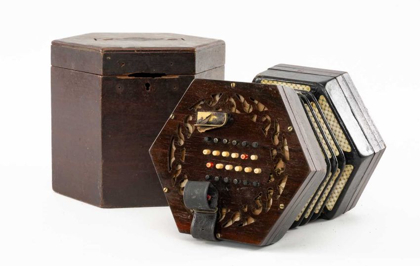 THE MUSIC CLUB HOUSE: LACHENAL & CO. 48 BUTTON CONCERTINA with rosewood ends, in hexagonal caseProvenance: private collection Anglesey
