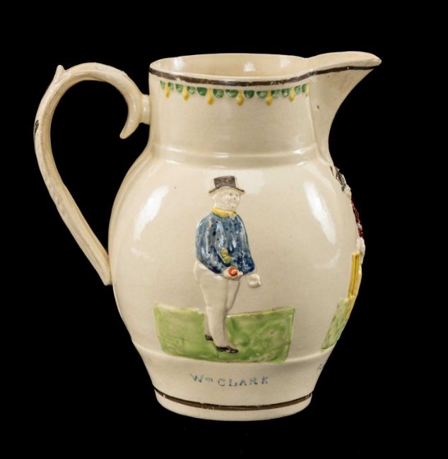 THE CRICKET CLUB HOUSE: Leeds 'Clarke, Pilch & Box' creamware jug, sprigged in relief with the three celebrated cricketers bowling, batting and keeping wicket, impressed mark, 17cms (h)Provenance: private collection BridgendNotes: Thomas Box (1808-1876) 1st class wicket keeper for Sussex County. William Clarke (1798-1865) 1st class cricketer, founder, manager and captain of the A. E. E. all England eleven. Fuller Pilch (1803-1870) was once referred to as the greatest batsman ever known until W. G. Grace.Comment: restored spout & handle.