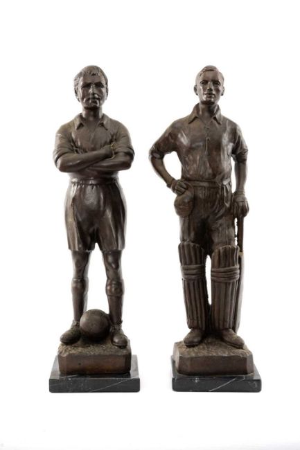 THE CRICKET CLUB HOUSE: PAIR PATINATED METAL SCULPTURES AFTER ÉMILE PICAULT, of a batsman on variegated black marble plinth, 46cms (h), together with matching sculpture of a footballer (2)Provenance: private collection Bridgend