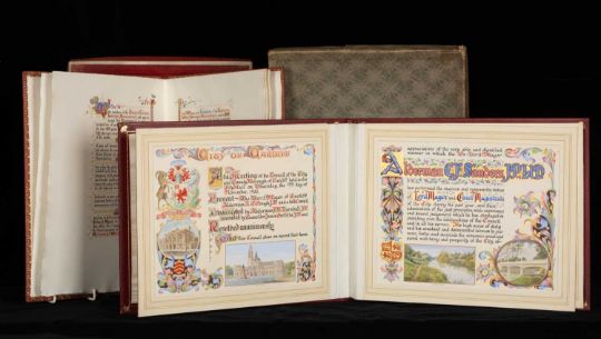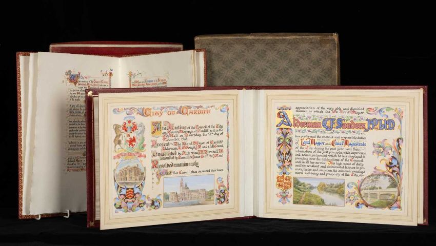 LORD MAYORAL CLUBHOUSE: ALDERMAN C.F. SANDERS J.P PRESENTATION BOUND CIVIC TESTIMONIAL of the Cardiff Central Liberal Association, beautifully illuminated in coloured inks and gilt, signed and dated '14 Dec 1933' in gilt brass applied and gilt tooled morocco, boxed; with similarly lavishly illuminated civic presentation album in thanks for his year of Mayoral service, signed and dated '9 Nov 1933', also gilt brass applied and gilt tooled morocco board, boxed (2)Provenance: private collection Vale of Glamorgan