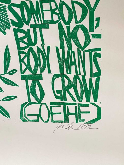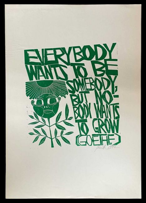 ‡ PAUL PETER PIECH (American, lived / worked Wales 1920-1996) woodcut print - quote from German poet and playwright Goethe, 'Everybody wants to be somebody, but nobody wants to grow', signed and dated 1992, 64 x 45cmsProvenance: private collection NetherlandsComments: unframed