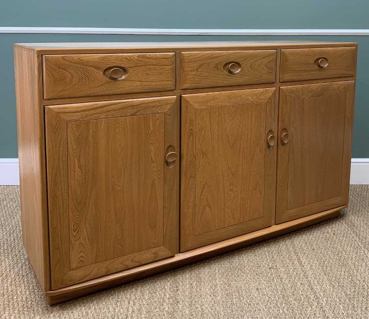ERCOL WINDSOR HIGH SIDEBOARD 2074, height adjustable internal wooden shelves, 93 (h) x 155 (w) x 46cms (d)Provenance: consigned via West WalesComments: two dints to top, very light scratches, excellent overall, inspection advised