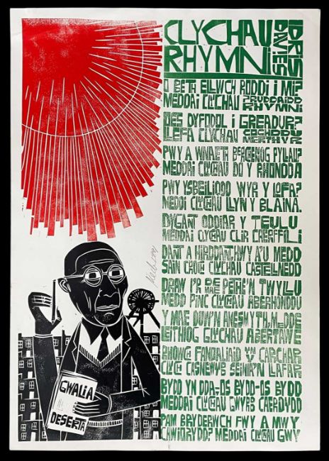 ‡ PAUL PETER PIECH (American, lived / worked Wales 1920-1996) three colour woodcut print - Welsh language poem by Idris Davies entitled 'Clychau Rhymni' (Rhymney Bells), signed and dated 1991, 64 x 45cmsProvenance: private collection NetherlandsComments: unframed