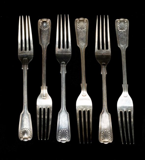 20TH CENTURY SILVER DESSERT FORKS, London 1902 and 1976, double-struck fiddle, thread, and shell pattern, two with engraved armorials, total weight approx. 12ozt (6)Provenance: private collection Cardiff