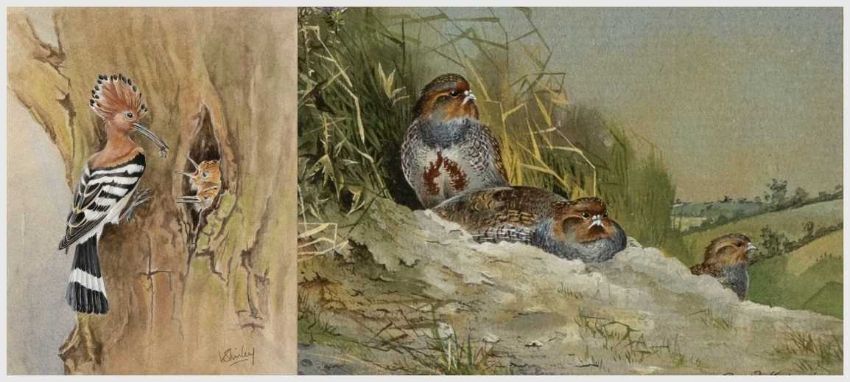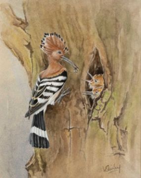 ‡ DAVID KERR (b.1952) watercolour - grey partridges, signed, 6 x 8cms, framed and glazed, VALERIE SHIRLEY (20th c. British) watercolour - entitled verso, 'Hoopoe and Young', signed, 27 x 22cms, framed and glazed (2)Provenance: private collection ConwyComments: as above