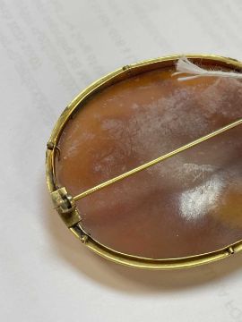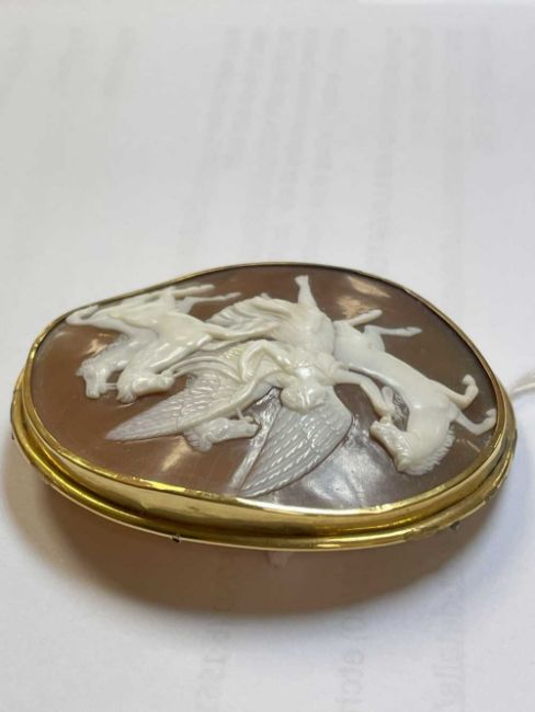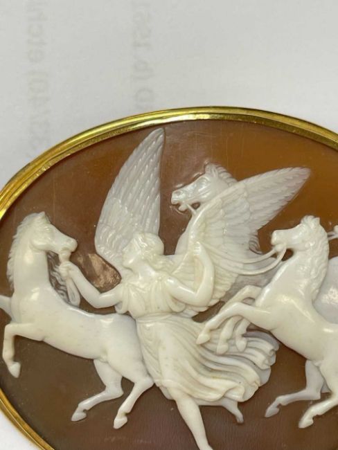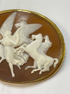 19TH CENTURY CARVED OVAL CAMEO BAR BROOCH depicting Nike, the winged Victory, conducting the four horses of the Sun, yellow metal setting, 6.5cms wideProvenance: private collection PembrokeshireComments: wear overall, setting unmarked, viewing recommended