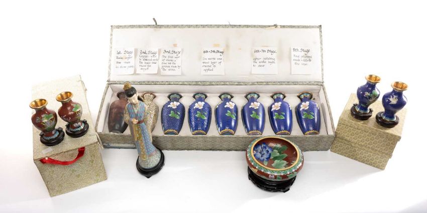 ASSORTED 20TH C. CLOISONNE ENAMEL WARES comprising boxed Empress figurine on hardwood base, two boxed pairs of baluster vases, boxed set of vases depicting the stages of the enamelling production process and a circular squat vase on hardwood baseProvenance: private collection SwanseaComments: good overall, viewing recommended