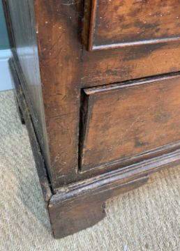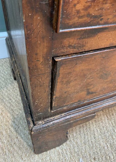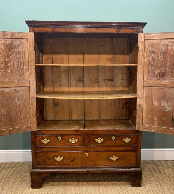 18TH C. JOINED YEW CUPBOARD, possibly Irish, ogee cornice above panelled cupboard doors, shelved inner, two short over one long drawer, brass 'bat-wing' drawer pulls, escutcheons, on tall bracket feet, 183 (h) x 127 (w) x 54cms (d)Provenance: with Richard Bebb, Carmarthenshire; private collection Wiltshire.Comments: fine colour and patina, plinth/feet with old worm damage, warped drawer fronts, various splits, drawer handles incomplete, one piece