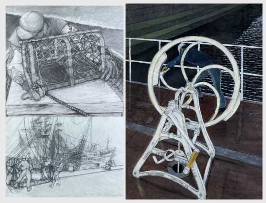 ‡PHILIP MUIRDEN (1932-2023) mixed media - entitled verso, 'Dock Wheel', signed, 68 x 48cms, framed and glazed, pencil on paper - entitled, 'Man & Trap No.1', fully signed, 49 x 53cms, framed and glazed, pencil on paper - entitled, 'Milford Haven, Belgium Fisherman', signed, 47 x 67cms, framed and glazed (3)Auctioneers Note: Philip Muirden was born in Pembrokeshire and educated at Haverfordwest Grammar School. He went on to study at Cardiff College of Art before completing a Master’s Degree at The Royal Academy of Art. Philip became a lecturer at Mansfield College of Art from 1965 to 1972 and a Senior Lecturer at Newport College of Art from 1972 to 1991. A draughtsman of the very highest order, Philip’s drawings of marine subjects are both breath-taking and brilliant in their observation and what he described as ‘retinal experience’. There is a strong surreal element to his paintings, showing very imaginative and poetic handling with what he termed ‘considerations of surreal and social themes’. During his life as an artist Philip Muirden always avoided the production of works with a unified, pre-conceived brand image. His output contains celebrations of his ‘retinal images’, such as the wonderful fishing boat subject matter he painted. His intellectually inspired work and reflections on the human condition were frequently presented.Provenance: decreased estate, PembrokeshireComments: frames/glazing loose, combined image of paintings not to scale, see description for measurements, inspection advised