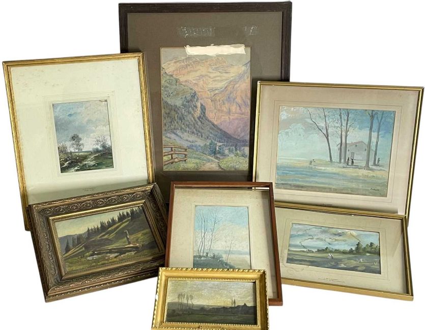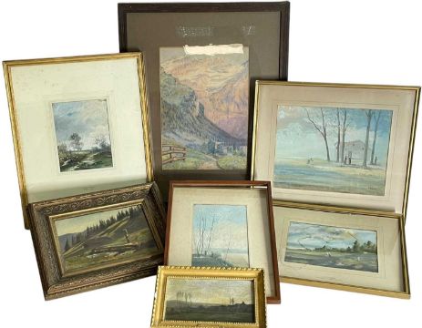 MANNER OF JEAN-BAPTISTE-CAMILLE COROT, watercolours with gouache - four entitled ‘Environs de Beaurepaire’, 'Pres d’Eu’, ‘Environs de Surtainville’, ‘Pres Am…. deux heures après midi’, some bearing signatures, smallest 15 x 20.5cms, largest 37 x 26cm, and an oil painting of a water trough in another hand (7)Provenance: deceased estate Gwynedd.Comments: one badly water stained, others with fading, toning, spotting etc. inspection advised.