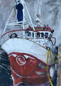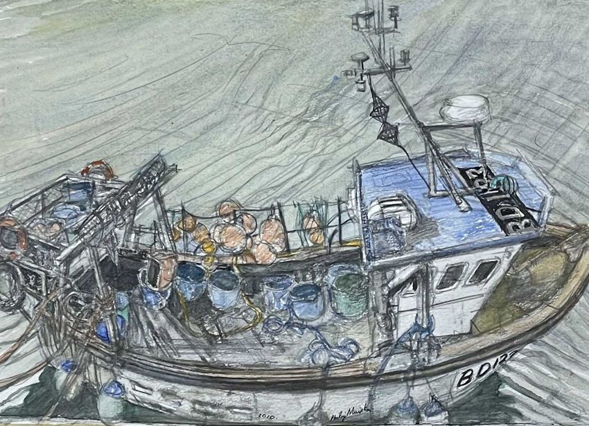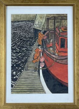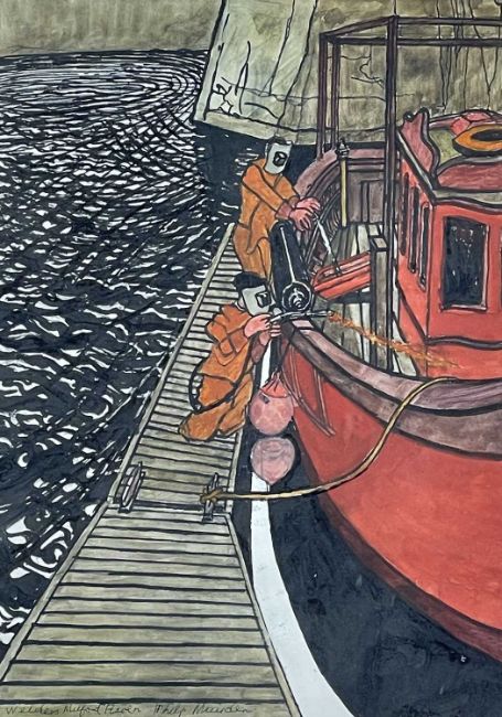 ‡ PHILIP MUIRDEN (1932-2023) mixed media - collection of seven paintings all themed around fishing vessels and their workers, titles include, 'Marina', 'Departure', 'Ready to Go', 'Welders', 'Lecky', 'Boat Cover' and 'Landing', six are signed, all similar sizes, 30 x 40cmsAuctioneers Note: Philip Muirden was born in Pembrokeshire and educated at Haverfordwest Grammar School. He went on to study at Cardiff College of Art before completing a Master’s Degree at The Royal Academy of Art. Philip became a lecturer at Mansfield College of Art from 1965 to 1972 and a Senior Lecturer at Newport College of Art from 1972 to 1991. A draughtsman of the very highest order, Philip’s drawings of marine subjects are both breath-taking and brilliant in their observation and what he described as ‘retinal experience’. There is a strong surreal element to his paintings, showing very imaginative and poetic handling with what he termed ‘considerations of surreal and social themes’. During his life as an artist Philip Muirden always avoided the production of works with a unified, pre-conceived brand image. His output contains celebrations of his ‘retinal images', such as the wonderful fishing boat subject matter he painted. His intellectually inspired work and reflections on the human condition were frequently presented.Provenance: decreased estate, PembrokeshireComments: framed, ready to hang
