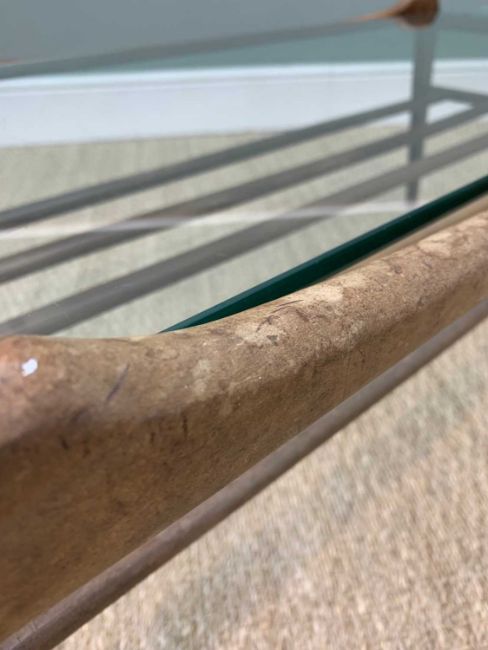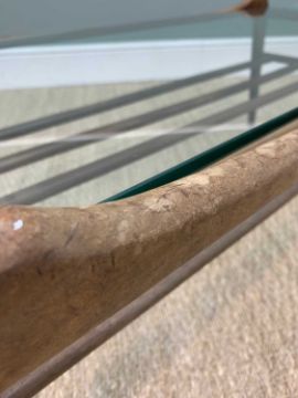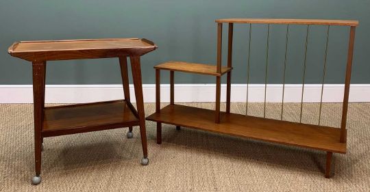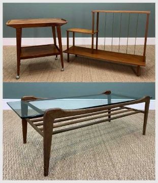 SELECTION OF MID-CENTURY FURNITURE comprising teak and glass coffee table, probably G Plan, 40 (h) x 119 (w) x 50cms (d), Remploy trolley table and mini room divider/bookcase (3)Provenance: consigned via West WalesComments: coffee table frame stained/bleached and loose, glass with chip to corner, other items stained, divider with loose rod, inspection advised