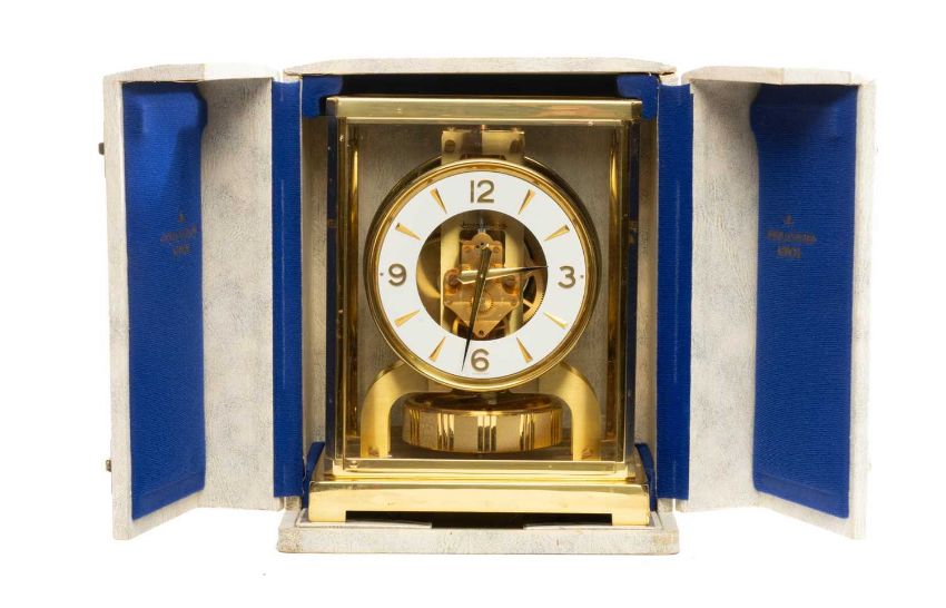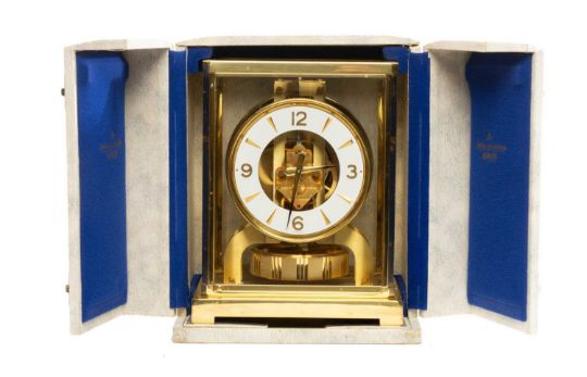 JAEGER LECOULTRE 'ATMOS' CLOCK, Classic V, brass dial with white chapter ring bearing Arabic numerals at quarters, skeleton single chain movement, the canted rectangular case with glazed top and sides, the front with lever release, serial number 323975, in fitted blue lined off-white case and outer card box, 22.5cmsProvenance: private collection Vale of GlamorganComments: little used, overall very good, printed logo to glass slightly rubbed, case with splits along edges