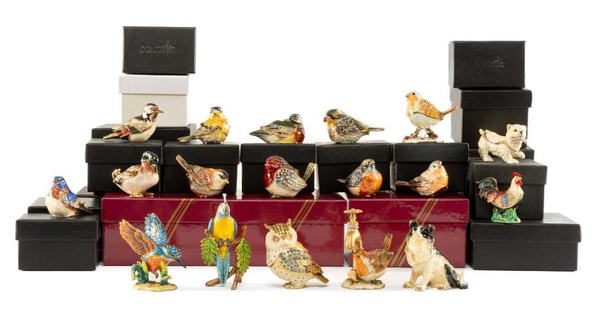 COLLECTION OF ENAMELLED TRINKET BOXES, three from The Leonardo Collection 'Crystal Delights': Scottie Dog, Collie, and Mallard; seven from Impressions by Juliana: Macaw, Mouse, Terrier, Robin, Kingfisher, Blue Tit, and Robin under a tap; together with twelve from Orchid Designs: Finch, Duck, and ten other assorted birdsProvenance: private collection CardiffComments: all boxed and appear in good condition