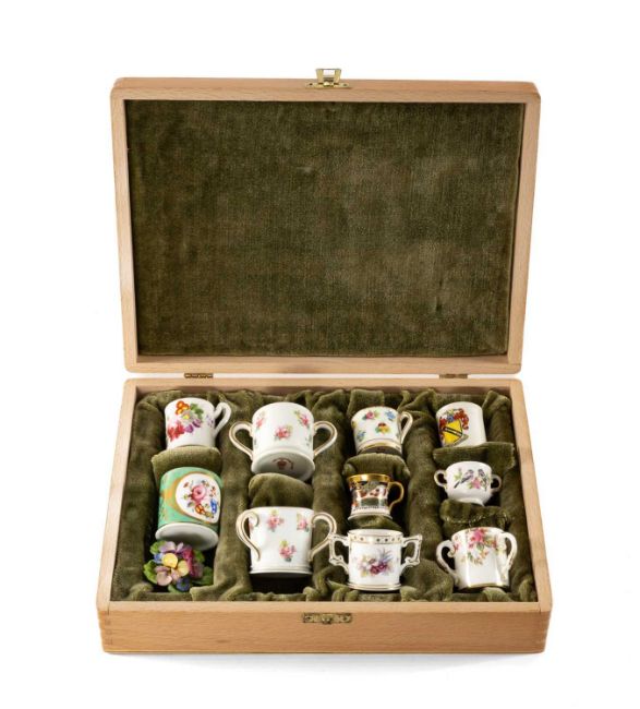 ASSORTED CHINA MINIATURES, including Spode Japan pattern tankard, Royal Crown Derby rose tyg and loving cup, Mintons rose/forget-me-not/pansy tankard, Coalport rose loving cup, Goss crested tankard, Crown Staffordshire floral brooch etc. (11)Provenance: private collection CardiffComments: good overall.